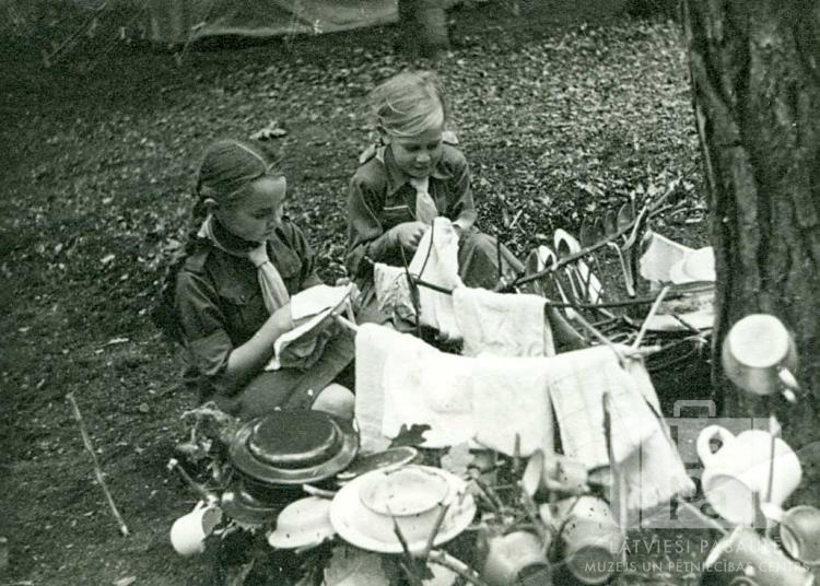 Skrundas 7. gaidu vienības guntiņas no Hānavas nometnes (amerikāņu zonā) slauka traukus un sakārto trauku noliktavu savā gaidu nometnē. Trauku noliktava ir veidota no koku zariem, uz tās žūst trauki un dvieļi. Fonā ir redzama daļa uzslietas telts.