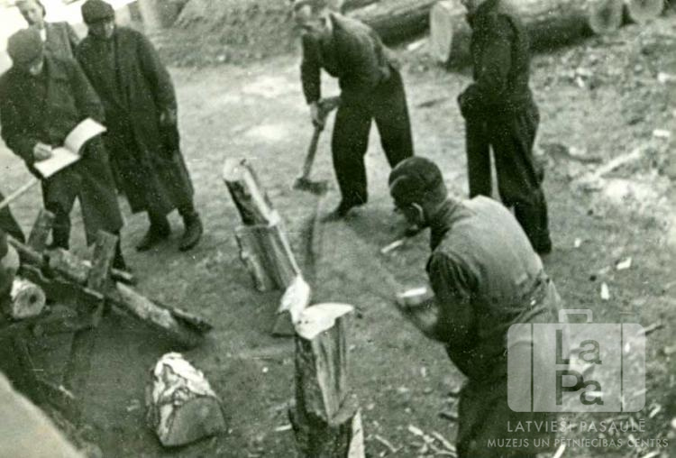 Malkas sagatavošanas talka Hānavas nometnē (amerikāņu zonā). Divi vīrieši skalda, citi stāv apkārt. Viens vīrietis veic pierakstus atvērtā piezīmju grāmatā (?). Priekšplānā ir redzams Haralds Grīns (pamatskolas pārzinis). Aizmugurē, ceturtais no kreisās: Dr. Olģerts Fedders (ar cirvi rokās).