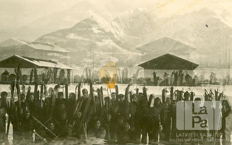 Hānavas nometnes ģimnāzijas grupa slēpošanas izbraukumā Berhtesgādenē (amerikāņu zonā) 1947. gada ziemā. Grupa ar slēpēm. Fonā ir sniegotu kalnu virsotnes. Izplūdis attēls.
