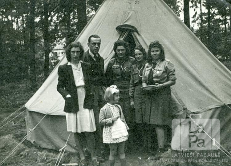 Hānavas nometnes (amerikāņu zonā) komandants ? Korsts ar ģimeni ciemos pie gaidu vadītājām viņu telts priekšā 1948. gada vasarā. Gaidu vadītājas ir ģērbušās formastērpos. Fonā ir mežs. Priekšā: Anda Korsts (bērnībā). Aizmugurē, no kreisās: ? Korsts, ? Korsts (komandants), Ritma Ceipe, Alma Siliņa un Vija Miķelsone.