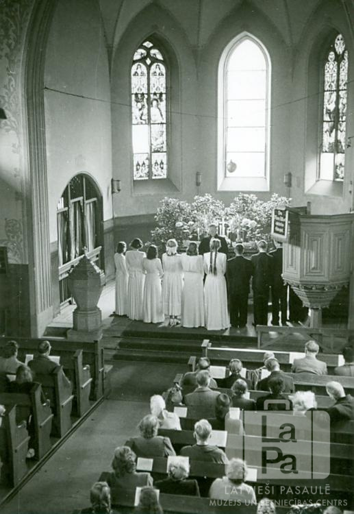 Prāvests ? Birznieks iesvēta jauniešus Hānavas Kesselstadtes baznīcā (amerikāņu zonā). Jaunieši gaišās kleitās un uzvalkos, ar mugurām pret fotogrāfu, stāv pie altāra, viņu priekšā stāv mācītājs amata tērpā. Priekšplānā ir krēslu rindas ar apmeklētājiem. Skats no augšas. Pie altāra stāvošās jaunietes gaišās kleitās, no kreisās: Rasma Ruļikova, Rūta Ruļikova (pr. Beķere), Rasma Balode, Mirjama Krūmiņa, Ilze Viļuma un Mirdza Zvaigzne.