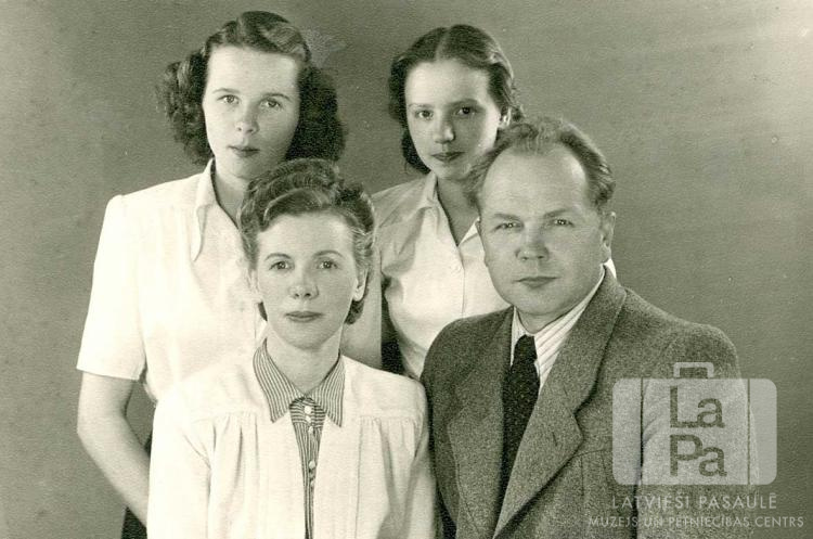 Ruļikovu ģimenes portrets Hānavā (amerikāņu zonā). Māte, tēvs un divas meitas. Priekšā, no kreisās: Irma Ruļikova, Voldemārs Ruļikovs. Aizmugurē, no kreisās: Rūta Ruļikova (pr. Beķere) un Rasma Ruļikova.