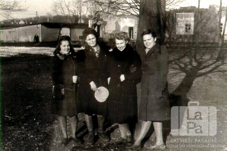 Ģimnāzijas 2. klases jaunietes ceļā uz galda tenisa sacensībām Kaselē (amerikāņu zonā). Visas ir ģērbušās mēteļos, vienai rokās ir galda tenisa raketes. Aizmugurē ir koka stumbrs. Fonā ir vairākas ēkas; kreisajā pusē pie ēkas pastaigājas cilvēks. Trešā no kreisās: Rūta Prauliņa.