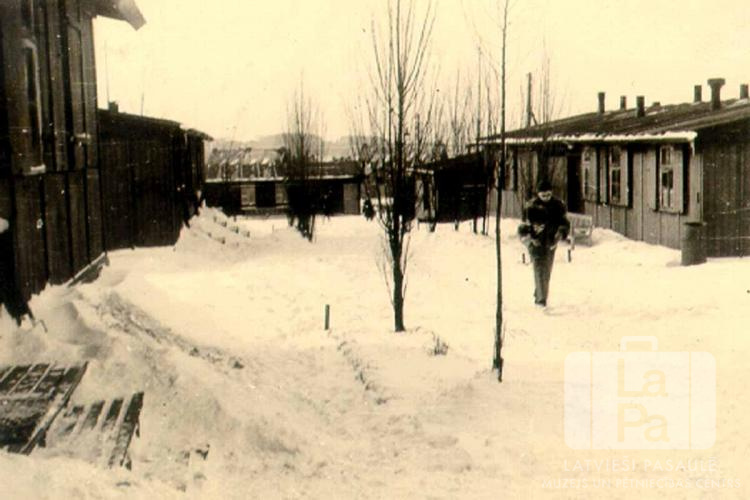 Zēns soļo pa apsnigušu ielu garām vienstāvu koka barakām Flintbekas nometnē (angļu zonā). Ielas malās ir krūmi bez lapām.