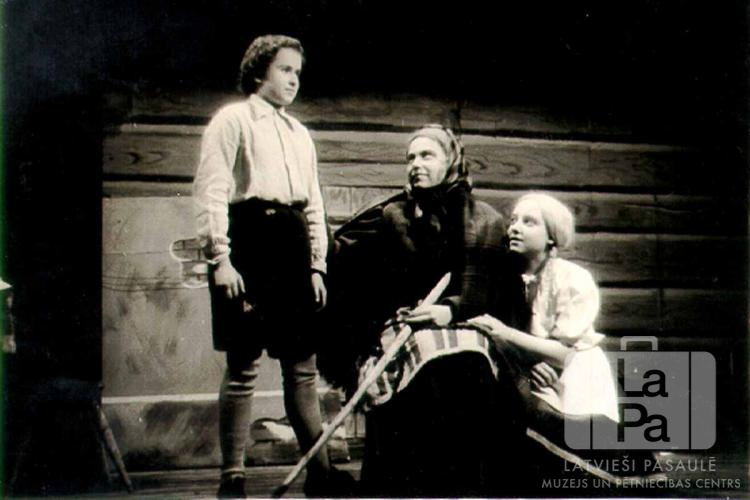 Trīs aktrises tērpos uz skatuves Annas Brigaderes lugā "Sprīdītis" Frīdrihsortas nometnē Ķīlē (angļu zonā). Lugu iestudēja un uzveda skolēni. Kreisajā pusē jauna meitene stāv kājās, viena sieviete sēž uz krēsla, viņai pa labi jauna meitene sēž uz grīdas. Fonā ir guļbūves iekārtojums. No kreisās Lidija Kurciga ("Sprīdītis"), Rūta Prauliņa ("vecmāte") un nezināms ("Lienīte").