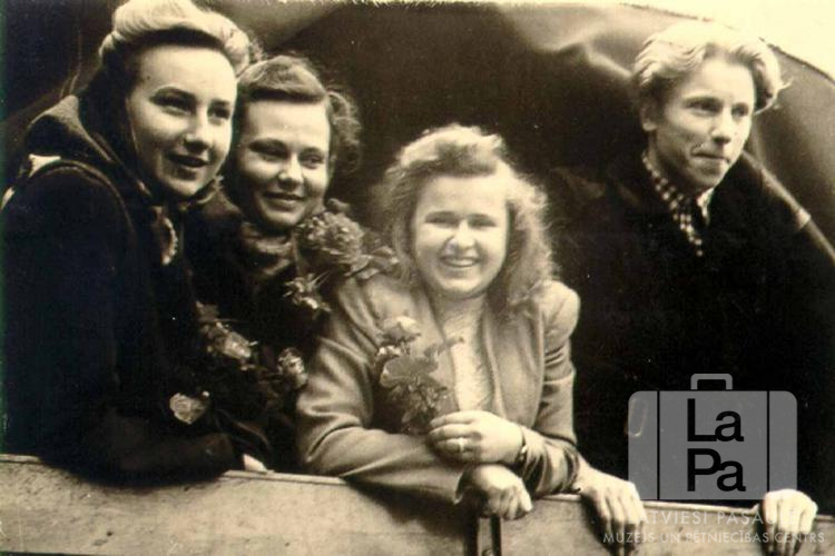 Četri jaunieši no Frīdrihsortas nometnes Ķīlē (angļu zonā) smagās kravas mašīnas aizmugurē. Trīs jaunietes ar ziediem rokās un viens jauneklis. Jaunieši organizācijas "United Nations Relief and Rehabilitation Administration" (UNRRA) smagajā kravas mašīnā dodas uz Pinnebergas ģimnāziju, lai turpinātu savu izglītību pēc Frīdrihsortas ģimnāzijas Ķīlē slēgšanas un apvienošanas ar citām latviešu ģimnāzijām. No kreisās: Maija Prauliņa, Ruta Blūmberga, Lidija Kurciga un Olģerts Kurcigs. Par šo gadījumu Rūta Prauliņa stāsta: "Ar šo daudziem pusaudžu ģimnāzistiem sākās jauns piedzīvojums – dzīvot internātā prom no savām ģimenēm."