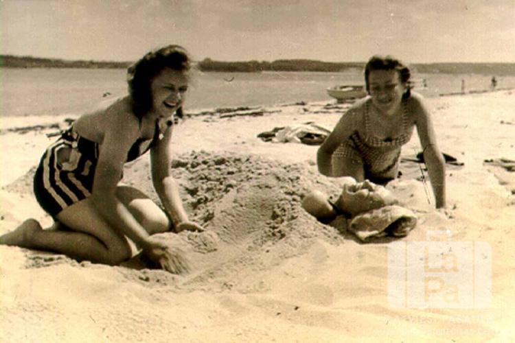 Trīs draudzenes Baltijas jūras malā netālu no Frīdrihsortas nometnes Ķīlē (angļu zonā) 1948. gada vasarā. Divas smejošas jaunietes peldkostīmos ber gaišas smiltis virsū trešajai jaunietei. Fonā ūdens malā ir maza laiva; otrpus ūdenim ir redzams krasts. Otrā no kreisās: Rūta Prauliņa (guļ smiltīs).