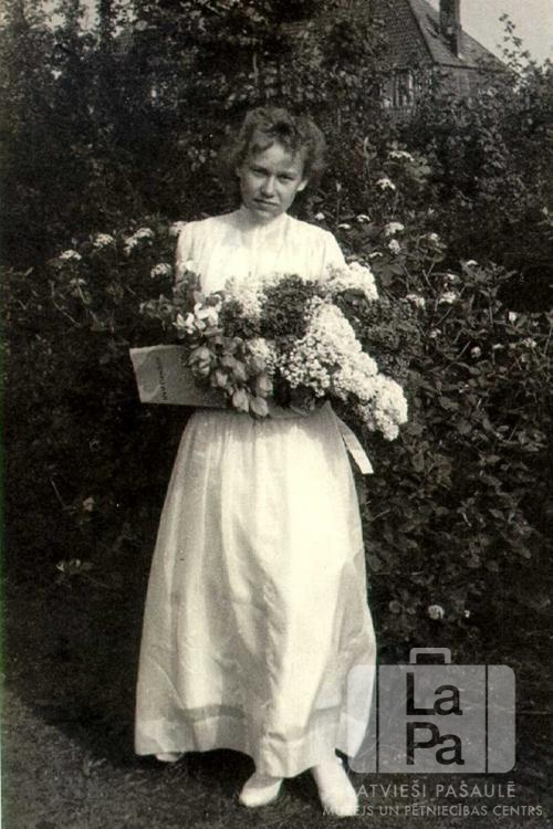 Rūta Prauliņa latviešu jauniešu iesvētībās Frīdrihsortas nometnē Ķīlē (angļu zonā). Jauniete gaišā kleitā tur rokās ziedu pušķi un dokumentu. Fonā ir krūmāji ar ēku aizmugurē.