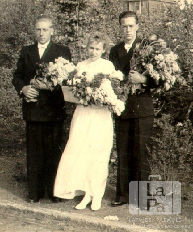 Trīs jaunieši iesvētībās Frīdrihsortas nometnē Ķīlē (angļu zonā). Divi jaunekļi stāv uzvalkos, vidū stāv jauniete gaišā kleitā. Visi tur rokās ziedu pušķus. Fonā ir krūmāji ar ēku aizmugurē. No kreisās: Gunārs Grūbe, Ruta Prauliņa un Uldis Gosts.