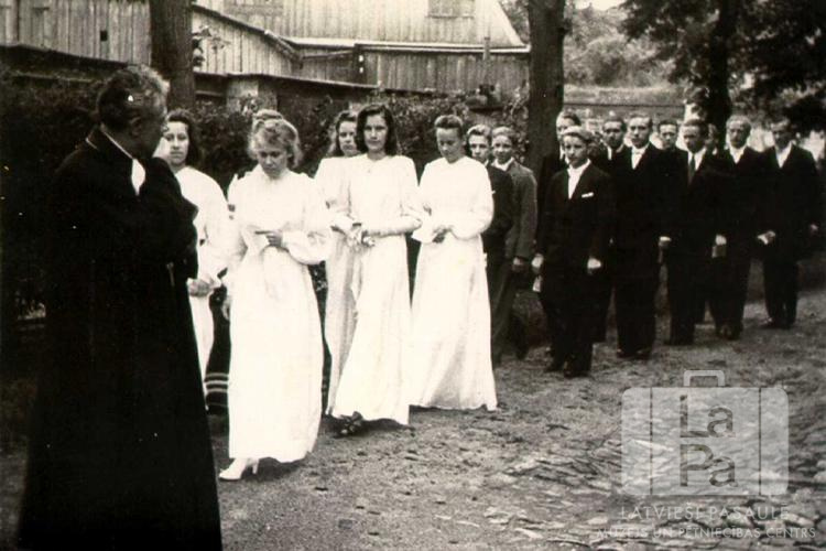 Mācītājs ved iesvētāmos jauniešus iesvētībās Frīdrihsortas nometnē Ķīlē (angļu zonā). Aiz mācītāja amata tērpā soļo jaunietes gaišās kleitās un jaunekļi uzvalkos. Fonā ir koka ēkas. Pirmais no kreisās: ? Gabliks (mācītājs).