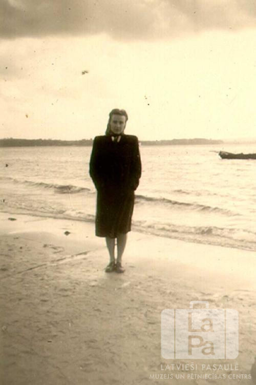 Maija Prauliņa no Frīdrihsortas nometnes Ķīlē (angļu zonā) tumšā mētelī stāv Baltijas jūras krastā. Aizmugurē labajā pusē ir maza laiva ūdenī. Fonā ir redzams jūras krasts. Par šo gadījumu Rūta Prauliņa stāsta: "Stāvot Baltijas jūras krasta baltās smiltīs, domas aizlido uz dzimteni Latviju. "