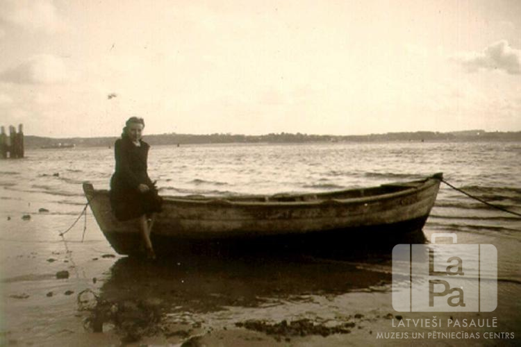 Maija Prauliņa no Frīdrihsortas nometnes Ķīlē (angļu zonā) tumšā mētelī sēž uz koka laivas Baltijas jūras krastā. Fonā ir redzams jūras krasts.