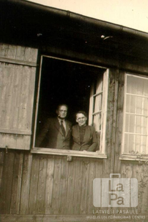 Prauliņu pāris pie savas vienstāvu koka barakas istabas loga Frīdrihsortas nometnē Ķīlē (angļu zonā). Pāris stāv ēkas iekšā, logs ir atvērts. No kreisās: Ernests Prauliņš un Milda Prauliņa.