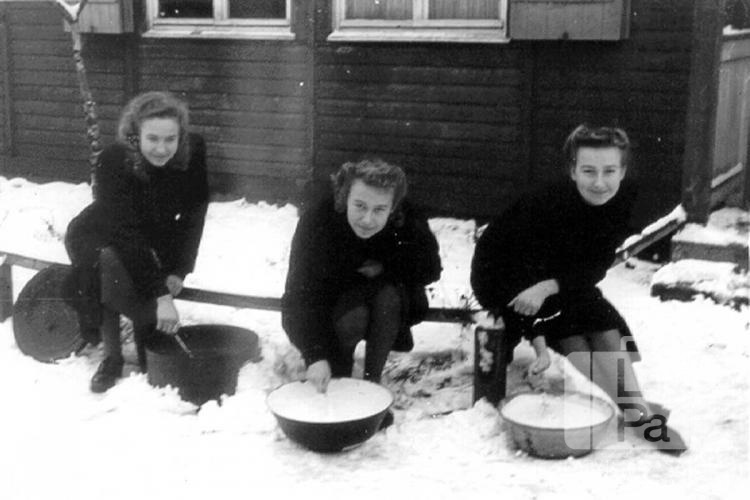 Trīs jaunietes sniegā kuļ vājpienu Frīdrihsortas nometnē Ķīlē (angļu zonā) 1947. gada ziemā. Jaunietes sēž uz zemas koka apmales, ar traukiem priekšā uz zemes. Viena jauniete izmanto katlu, divas pārējās – bļodas. Fonā ir koka baraka. No kreisās: Iriita Vilka, Rūta Prauliņa un Maija Prauliņa.