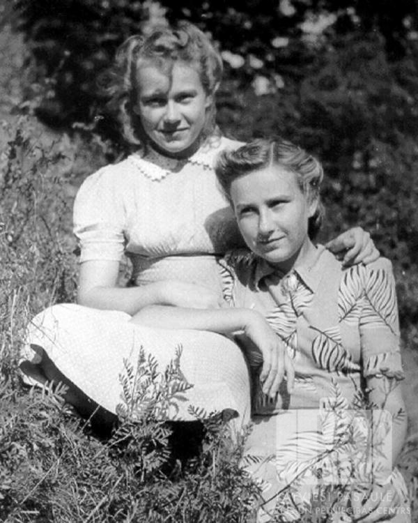 Prauliņu ģimenes māsas no Frīdrihsortas nometnes Ķīlē (angļu zonā) 1947. gada vasarā. Jaunietes gaišās kleitās sēž uz nogāzes. Fonā ir koki. Blakus atrodas Ķīles – Ziemeļjūras kanāls. No kreisās: Rūta Prauliņa un Maija Prauliņa.
