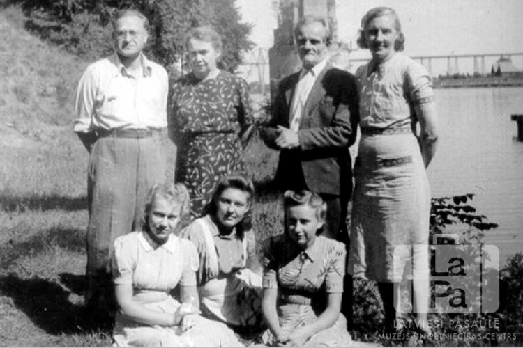 Divas ģimenes no Frīdrihsortas nometnes Ķīlē (angļu zonā) 1947. gada vasarā stāv Ķīles kanāla krastā. Priekšā trīs jaunietes sēž zālē, aizmugurē stāv vecāki. Fonā kanāla krastā aug koki; tālumā ir redzams tilts pāri kanālam. Pirmajā rindā, no kreisās: Rūta Prauliņa, Ataudziņa Rita Bankoviča un Maija Prauliņa. Aizmugurē stāv, no kreisās: Ernests Prauliņš, Milda Prauliņa, Andris Bankovičs un Emīlija Bankoviča. Par šo gadījumu Rūta Prauliņa stāsta: "Ģimenes, kas iepazinās uz kuģa, atstājot Rīgu, nodzīvoja tanīs pašās DP nometnēs un nonāca Mineapoles pilsētā, ASV, kur vēl šodien, pēc 60 gadiem, meitas ir draudzenes. Aizmugurē redzams ir slavenais Ķīles – Ziemeļjūras kanāls ar tā pazīstamiem augstiem tiltiem."
