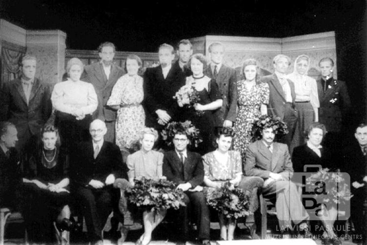 Tēlotāju kopsastāvs uz skatuves Andreja Iksena lugā "Putrienas valodnieki" Frīdrihsortas nometnē Ķīlē (angļu zonā). Lugu iestudēja un uzveda jaunieši. Aktieri divās rindās; pirmā rinda sēž uz krēsliem. Pirmajā rindā vairākiem cilvēkiem rokās un uz galvas ir lapu vainagi; otrajā rindā viena sieviete tur rokās ziedus. Fonā ir izrādes dekorācijas.
