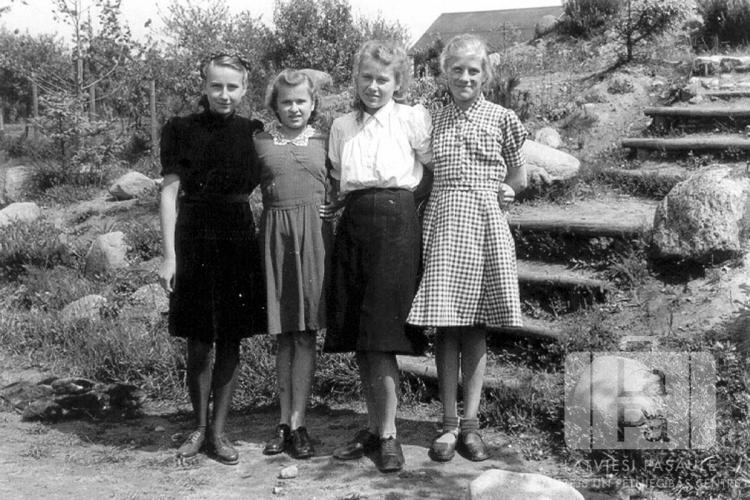 Četras draudzenes stāv dārzā Frīdrihsortas nometnē Ķīlē (angļu zonā) 1947. gada vasarā. Jaunietes apkampušās stāv kāpņu lejasdaļā. Aizmugurā ir akmeņains dārzs uz nogāzes. No kreisās: Maija Prauliņa, Lidija Kurciga, Mirdza Rone un Aijas Rone.