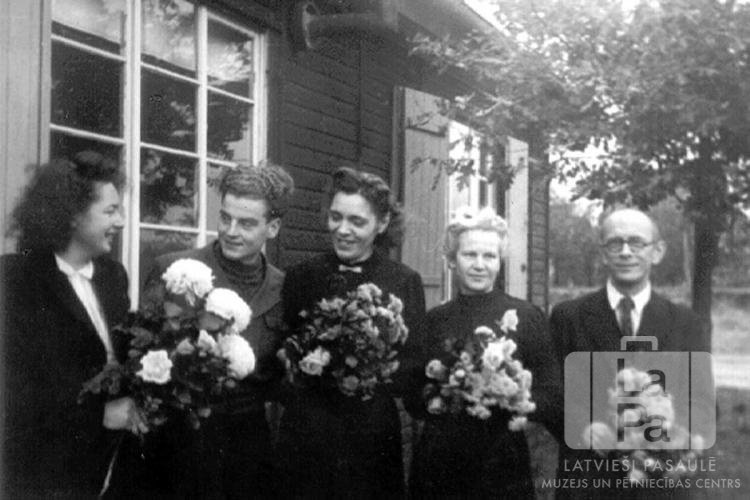 Ģimnāzijas audzēknis ar četriem skolotājiem pie skolas logiem Frīdrihsortas nometnē Ķīlē (angļu zonā). Ģimnāzija bija iekārtota vienstāvu koka barakā. Skolotājiem rokās ir puķes. No kreisās: pirmā Lidija Smilga-Bērziņa, trešā Veidenberga un piektā Jēkabs Vilks.