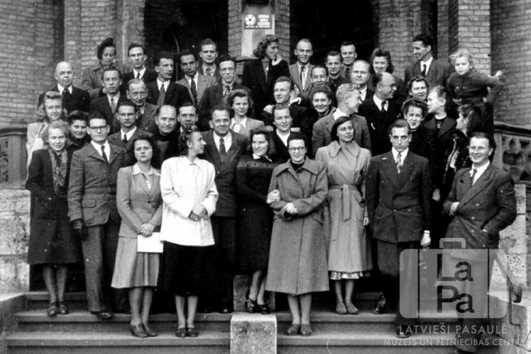 Kristīgās jaunatnes konferences grupa Imbshausenes pils priekšā. Konferencē piedalījās arī jaunieši no Frīdrihsortas nometnes Ķīlē (angļu zonā). Liela cilvēku grupa vairākās rindās stāv uz trepēm ķieģeļu ēkas priekšā.