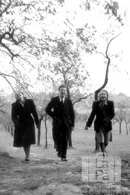 Trīs jaunieši pastaigājas kristīgās jaunatnes konferences laikā Imbshausenes pils apkārtnē. Konferencē piedalījās arī jaunieši no Frīdrihsortas nometnes Ķīlē (angļu zonā). Fonā ir zemu koku rindas bez lapām. No kreisās: Ataudziņa Rita Bankoviča, Paulis Urdze (mācītājs) un Rūta Prauliņa.