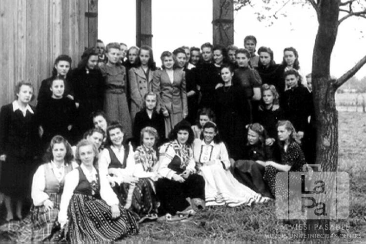 Ģimnāzistu grupa Pinnebergas apvienotās ģimnāzijas (angļu zonā) izlaiduma aktā. Grupā ir gan absolventes, gan citas ģimnāzistes. Priekšējā rinda sēž zemes, viņu vidū arī jaunietes tautastērpos. Priekšplānā labajā pusē ir redzams koka stumbrs. Aizmugurē kreisajā pusē ir koka ēkas dēļu stūris.Fonā labajā pusē ir lauks.