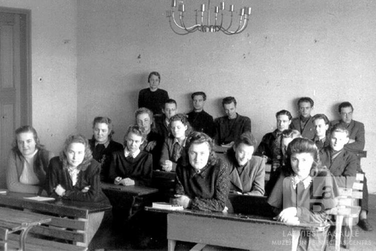 Ģimnāzijas piektās klases audzēkņi sēž skolas koka solos Pinnebergā (angļu zonā) 1948. gada pavasarī. Priekšējās rindās sēž jaunietes, pēdējos solos sēž jaunekļi. Aizmugurē stāv skolotāja. Pie griestiem karājas svečturis/ lampa. Starp jaunietēm ir redzamas: Brigita Slociņa, Irita Vilka, Ataudziņa Rita Bankoviča, Rūta Prauliņa, Irita Sakne, Mirjāna Plensnere, Guna Nagele, Anna Blūmberga, Astrīda Riekstiņa, Vija Tillere (aiz Astrīdas Riekstiņas). Jaunekļu vidū ir redzami: Pēteris Tocups, Astrīds Vigners, Uldis Inveiss, Gunārs Rutkovskis. Laimons Mangulis, Elmārs Freibergs un Uldis Gosts. Aizmugurē stāv: ? Ābele (skolotāja).