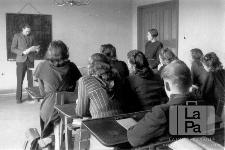 Ģimnāzijas piektās klases audzēkņi ar skolotāju klases telpā Pinnebergā (angļu zonā) 1948. gada pavasarī. Priekšplānā jaunieši sēž koka solos, ar mugurām pret fotogrāfu. Klases priekšā jaunietis lasa no papīra lapas. Aiz viņa ir tumša tāfele; pie griestiem karājas svečturis/ lampa. Pie telpas durvīm, kas ir redzamas kreisajā pusē aiz skolēniem, stāv skolotāja. Pirmais no kreisās: Udis Gosts (klases priekšā). Pie durvīm stāv: ? Ābele (skolotāja).