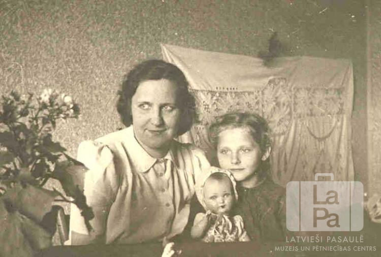 Lilija Ķeplasta ar meitu sēž istabā Marktredvicā (amerikāņu zonā) 1945. gada rudenī. Meita rokās tur lelli. Priekšplānā kreisajā pusē ir puķe. Fonā pie sienas ir gaiša, izšūta sega. No kreisās: Lilija Ķeplasta un Elga Ķeplasta. Par šo gadījumu Rute Maija Helmen (dz. Zariņa) stāsta: "Draudzene savā istabā ar lelli. Viņa bija vienīgā, kuŗai bija īsta lelle."