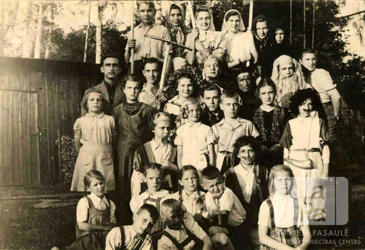Aktieru kopsastāvs vairākās rindās Annas Brigaderes lugā "Sprīdītis” Marktredvicā (amerikāņu zonā) 1946. gada pavasarī. Lugu iestudēja un uzveda Edvarda Virzas tautskolas skolēni. Visi aktieri ir tērpušies izrādes kostīmos un grimā; vairāki aktieri rokās nūjas un darbarīkus. Fonā ir izrādes dekorācijas – vienstāvu koka baraka un mežs. Priekšā sēž, otrais no kreisās: Jānis Lorbergs. Otrajā rindā, no kreisās: Māra ?, Anna Rozberga, Rute Maija Zariņa (pr. Helmen), Imants Blauss un Astrīda Blauss. Trešajā rindā vidū ir redzami: Silvija Gubiņa, Kārlis Bumbiers ("Sprīdīša" lomas atveidotājs), Edīte ? un Valdis ?.
