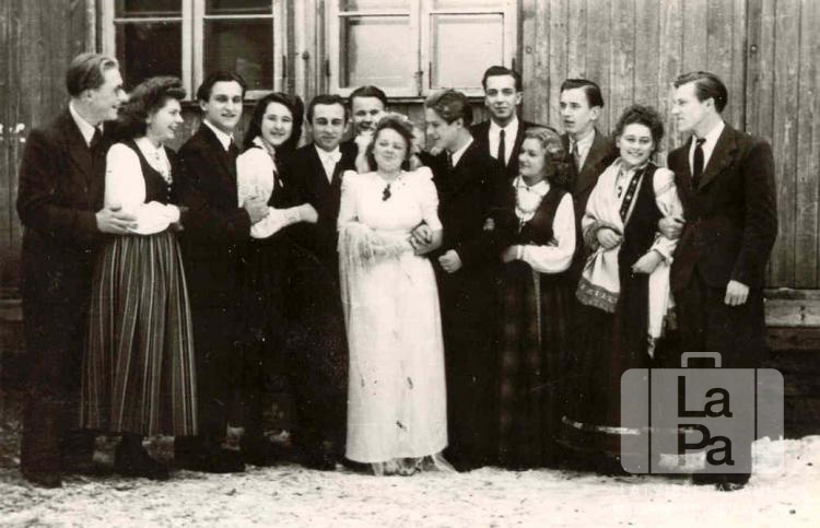 Ausmas Bērziņas kāzas Marktredvicā (amerikāņu zonā) 1946. gada vasarā. Jauni cilvēki stāv divās rindās pie koka ēkas loga. Priekšā, vidū, stāv līgava kāzu kleitā un līgavainis. Citas sievietes ir ģērbušās tautastērpos. Šajās kāzās piedalījās Bērziņi, Pebrīši, Bumbieri, Lorbergi, Petrovski, ? Ezergaile, ? Jākabsone, Ķeplasti un Zariņi. Pirmajā rindā, sestā no kreisās: Ausma Bērziņa (līgava).