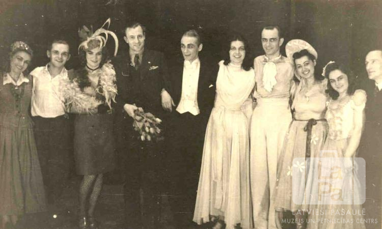 Rīgas baleta dejotāji viesošanās laikā Marktredvicā (amerikāņu zonā). Pieaugušie stāv rindā, ģērbušies kostīmos un ar grimu. Trim sievietēm ir krāšņas galvassegas, viens vīrietis rokās tur ziedus.