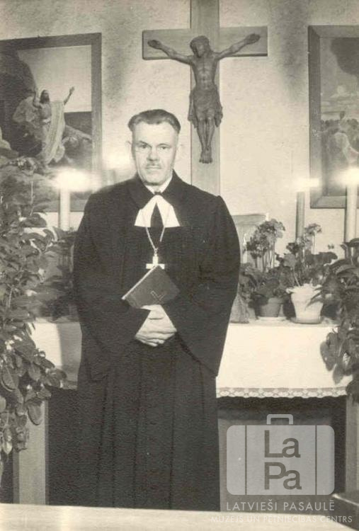 Luterāņu baznīcas mācītājs ? Brencis amata tērpā stāv altāra priekšā Bambergas nometnē (amerikāņu zonā). Mācītājam rokās ir grāmata. Uz altāra ir puķes vāzēs un aizdegtas sveces. Virs altāra ir koka krusts ar Jēzu Kristu; abās krusta pusēs ir divas gleznas.
