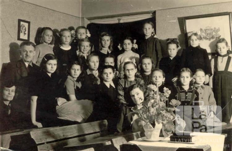 Svētdienas skola Bambergas nometnē (amerikāņu zonā). Bērni un pieaugušie iekštelpās. Cilvēki vairākās rindās. Priekšplānā ir galds ar puķu podu un grāmatām, kā arī koka soli. Aizmugurē, kreisajā pusē pie sienas, ir sievietes attēls. Aizmugurē, labajā pusē pie sienas, ir ierāmēts Latvijas ģerbonis. No kreisās: pirmā ? Cinauta (skolotāja, sēž) un otrais ? Brencis (mācītājs, stāv).