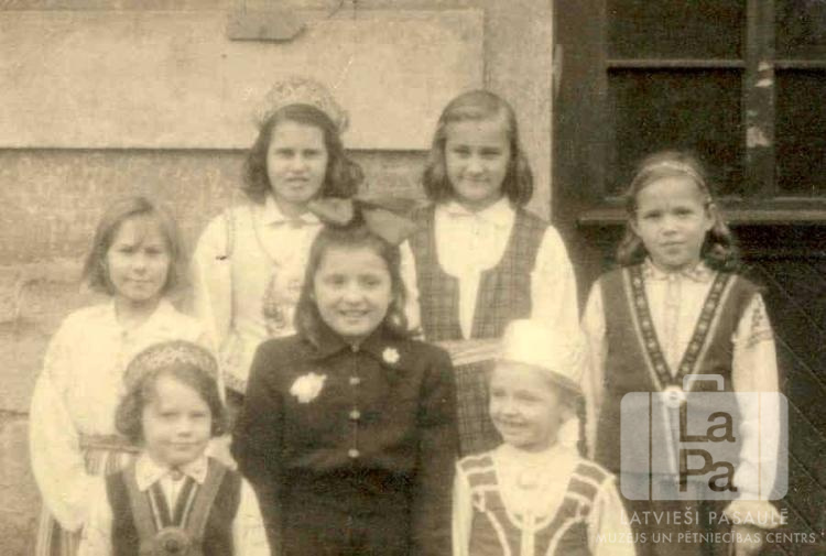 Valsts svētkos meitenes Bambergas nometnē (amerikāņu zonā) saģērbās tautastērpos. Meitenes stāv pie mūra ēkas; viņu vidū viena meitene ir ģērbusies tumšās drēbēs. Pirmā no labās: Rute Maija Zariņa (pr. Helmen). Grupā vēl ir redzamas: Iza ?, Edīte ?, Astrīda ?, Līvija ?, Māra ? un Lilija ?.