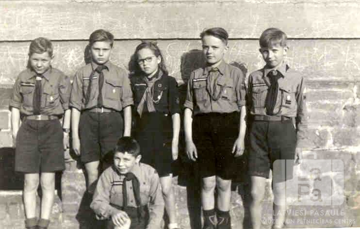 Mazskauti un guntiņa Bambergas nometnē (amerikāņu zonā) 1947. gada vasarā. Grupā ir Ugāles 78. skautu vienības mazskauti un Ugāles 23. gaidu vienības guntiņa. Priekšā sēž viens mazskauts, pārējie stāv aizmugurē kājās; visi ir ģērbušies formastērpos. Aizmugurē, trešā no kreisās: Rute Maija Zariņa (pr. Helmen).