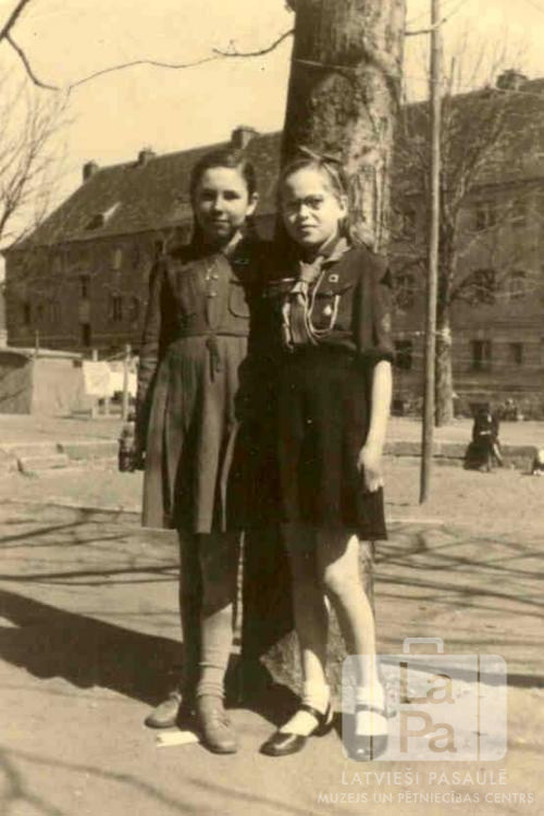 Divas bērnības labākās draudzenes stāv pie koka stumbra Bambergas nometnē (amerikāņu zonā) 1948. gada pavasarī. Viena meitene ir ģērbusies kleitā, otra – guntiņas formastērpā. Fonā ir trīsstāvu mūra ēka. No kreisās: Dzintra Petrīte un Rute Maija Zariņa (pr. Helmen). Par šo gadījumu Rute Maija Helmen (dz. Zariņa) stāsta: "Pēc trīsu gadu draudzības Marktredvicas un Bambergas DP nometnēs mums bija jāšķiras. Petrīšu ģimene izceļoja uz ASV. Drīz pēc tam Bambergas nometni slēdza, un es ar mammu tikām pārvietotas uz Vircburgas Centrālo DP nometni. Tēvs nonāca Vildflekenas nometnē kā policists."
