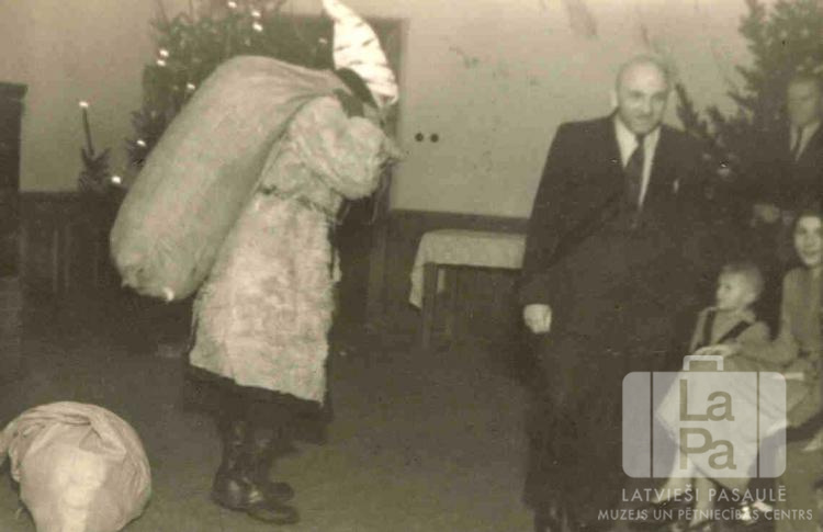 Svētku vecītis ar lielu maisu Ziemassvētku sarīkojumā Vildflekenas nometnē (amerikāņu zonā). Vīrietis ir ģērbies ziemas mētelī, ar spicu cepuri galvā. Labajā pusē ir skatītāji – divi vīrieši, sieviete un bērns. Fonā ir redzama egle ar aizdegtām svecēm. Pirmais no kreisās: Jūlijs Zariņš. Labajā pusē ir redzami: Merževkis kungs un kundze.