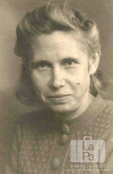 Elfrīdas Zariņas portrets Vildflekenā (amerikāņu zonā). Šī bija oficiālā imigrācijas fotogrāfija, kas bija uz zaļās (iebraukšanas) kartes ASV. Pusmūža sieviete adītā, pogājamā džemperī.
