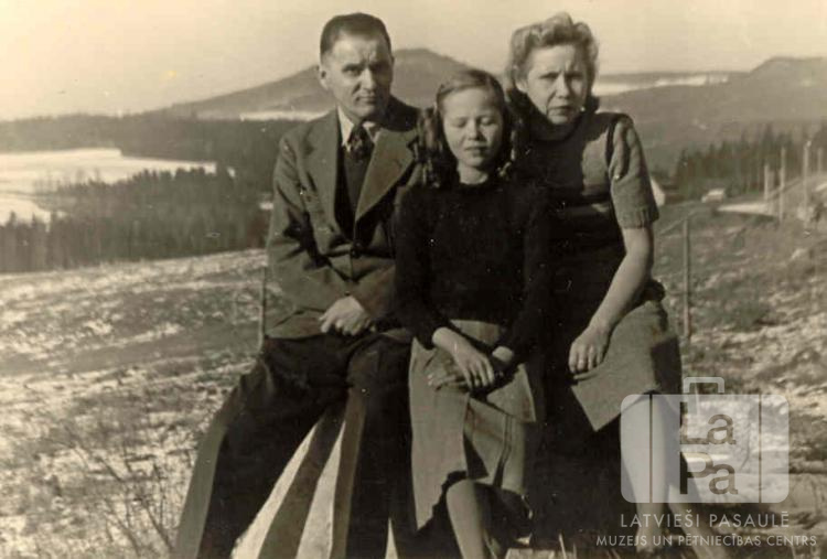 Zariņu ģimene no Vildflekenas nometnes (amerikāņu zonā) 1950. gada pavasarī. Tēvs, māte un meita sēž uz akmens. Fonā ir lauks uz nogāzes. Tālumā ir mežs, ūdenstilpe un kalnaina ainava. Par šo gadījumu Rute Maija Helmen (dz. Zariņa) stāsta: "Pēdējā fotogrāfija kā dīpīši ceļā uz Ameriku."