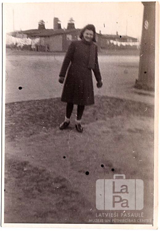 Sarma Veidis (pr. Gertners) stāv uz ielas "Heiligen Geist" nometnē Lībekā (angļu zonā) ap 1946. gadu. Jauniete ir ģērbusies ziemas drēbēs – tumšā mētelī, šallē un cimdos. Fonā ir vienstāvu barakas ar izkārtu veļu.