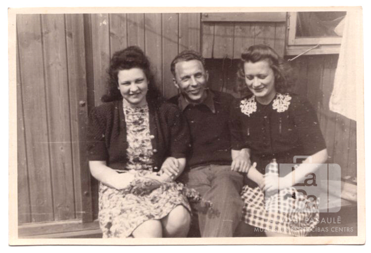 Trīs jaunieši sēž saulē pie koka dzīvojamās barakas "Heiligen Geist" nometnē Lībekā (angļu zonā) ap 1946. gadu. Divas jaunietes ar jaunu vīrieti pa vidu. No kreisās: pirmā Sarma Veidis (pr. Gertners), trešā Vera Michaļčuka.
