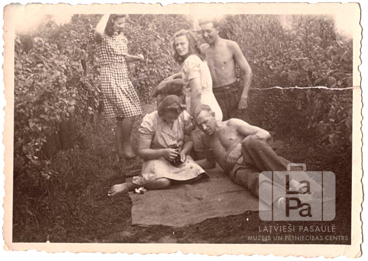 Pieci ģimnāzijas audzēkņi no Lībekas (angļu zonā) atpūšas zaļumos ap 1947. gadu. Divi jaunieši priekšā sēž uz izklātas segas. Trīs citi stāv aizmugurē. Divi puiši bez krekliem un trīs jaunietes kleitās; visiem basas kājas. Apkārt ir krūmājs. Priekšā, otrais no kreisās: Gunārs Stumbrs. Aizmugurē, otrā no kreisās: Vera Michaļčuka.