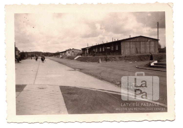 Iebrauktuve ar vienstāvu koka barakām "Heiligen Geist" nometnē Lībekā (angļu zonā) ap 1946. gadu. Uz iebrauktuves (plašas ielas) pastaigājas cilvēki. Labajā pusē uz paaugstinājuma ir divas vienstāvu koka barakas.