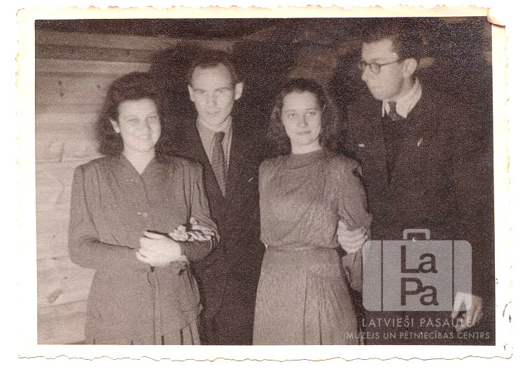 Četri jaunieši dodas uz koncertu Lībekā (angļu zonā) ap 1947. gadu. Divas jaunietes kleitās un divi jauni vīrieši uzvalkos. Fonā ir koka dēļu siena. No kreisās: pirmā Sarma Veidis (pr. Gertners) un trešā Vera Michaļčuka.