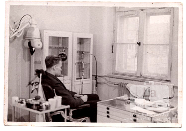 Vīrietis zobārstniecības kabinetā Lībekā (angļu zonā) ap 1948. gadu. Vīrietis sēž krēslā ar muguru pret fotogrāfu, ar skatu uz logu. Redzams kabineta iekārtojums, tostarp galdi ar instrumentiem, skapis; uz radiatora pie loga karājas divi dvieļi.