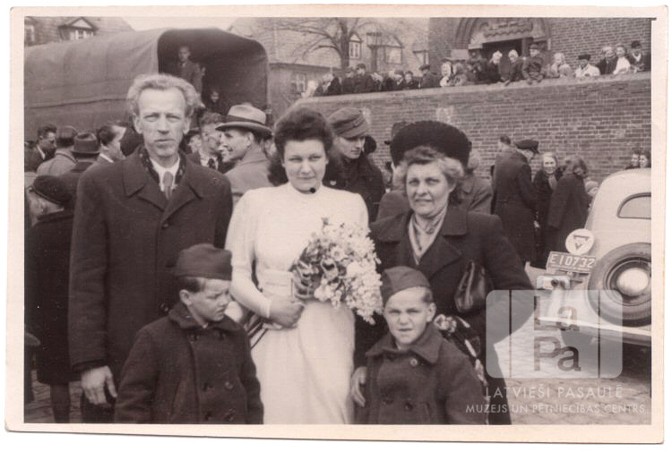 Veižu ģimene meitas iesvētību dienā Lībekā (angļu zonā) ap 1947. gadu. Priekšā stāv divi mazi dēli mēteļos un cepurēs. Otrajā rindā stāv tēvs mētelī, meita gaišā iesvētību kleitā un ziediem rokās, un māte tumšā mētelī, ar cepuri un rokassomu. Fonā kreisajā pusē ir cilvēku pūlis un smagā automašīna; fonā labajā pusē ir vieglā automašīna. Tālāk ir augsta ķieģeļu siena ar ar cilvēkiem tās augšā un mūra ēkām. Priekšplānā, pirmajā rindā, no kreisās: pirmais Miķelis Veidis, otrais Jānis Veidis. Priekšplānā, otrajā rindā, no kreisās: Andrejs Veidis, Sarma Veidis (pr. Gertners), Milda Veidis.