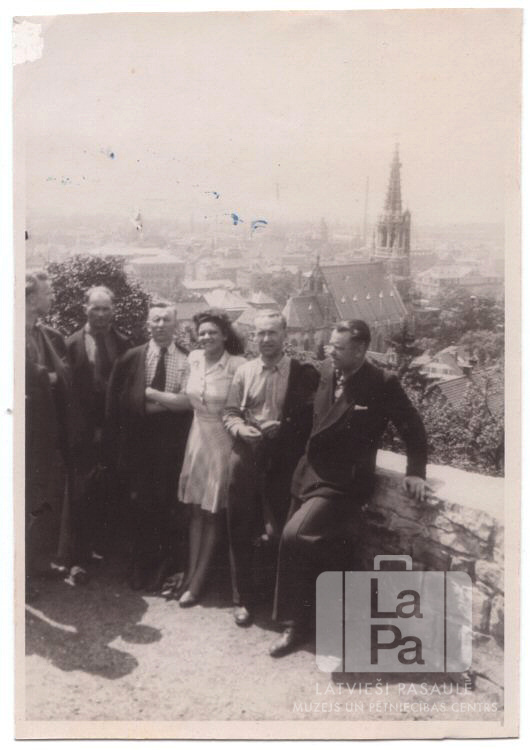 Zuikas vīra kora dalībnieki no Lībekas braucienā uz dziesmu svētkiem Eslingenē (amerikāņu zonā) ap 1946. gadu. Pieci vīrieši un viena sieviete. Fonā ir skats no augšas uz Marijas baznīcu ("Frauenkirche") un apkārtējām ēkām Eslingenes vecpilsētā. Ceturtā no kreisās: Sarma Veidis (pr. Gertners).