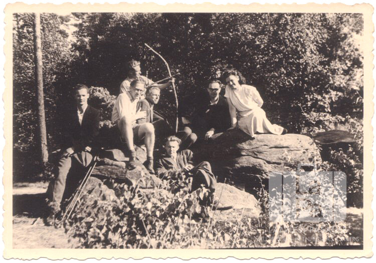 Septiņi jaunieši no Fallingbosteles nometnes (angļu zonā) sēž uz lieliem akmeņiem. Viens vīrietis rokās tur loku. Fonā ir mežs. No labās: pirmā Sarma Gertners (dz. Veidis) un otrais Valdis Gertners (?).