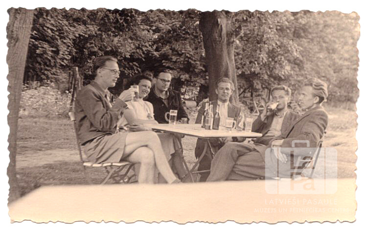 Septiņi jaunieši no Fallingbosteles nometnes (angļu zonā) sēž ap āra galdu. Uz galda ir glāzes un pudeles. Fonā ir mežs. No kreisās: otrā Sarma Gertners (dz. Veidis) un trešais Valdis Gertners (?; tumšā jakā).